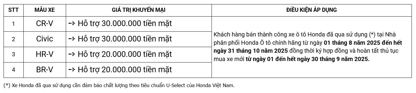 Nhằm cung cấp tới Quý khách hàng phương án giao dịch xe ô tô đã qua sử dụng minh bạch, thuận tiện, Honda Việt Nam đã triển khai Chương trình “Hỗ trợ siêu hời – Lên đời xế mới”. Từ ngày 01 tháng 09 năm 2025 đến hết ngày 30 tháng 09 năm 2025, HVN phối hợp cùng Honda Ôtô Sài Gòn - Cộng Hòa triển khai chương trình khuyến mại hấp dẫn cho khách hàng đổi xe mới chính hãng.