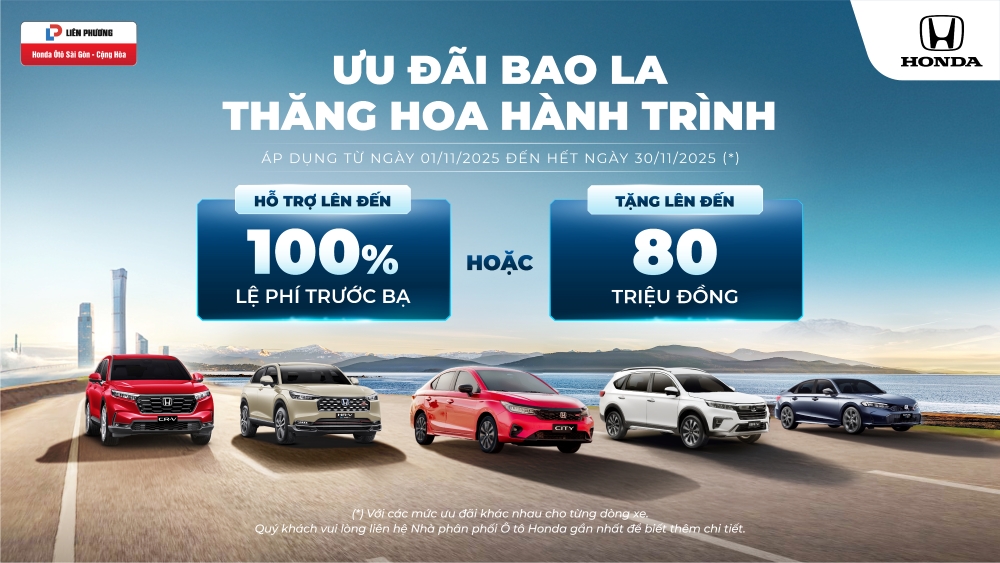 Honda Việt Nam phối hợp cùng Honda Ôtô Sài Gòn - Cộng Hòa triển khai tháng tri ân với khuyến mại cực lớn dành cho các mẫu xe ô tô Honda theo danh sách dưới đây, chương trình khuyến mại diễn ra từ ngày 01 tháng 11 năm 2025 đến hết ngày 30 tháng 11 năm 2025.