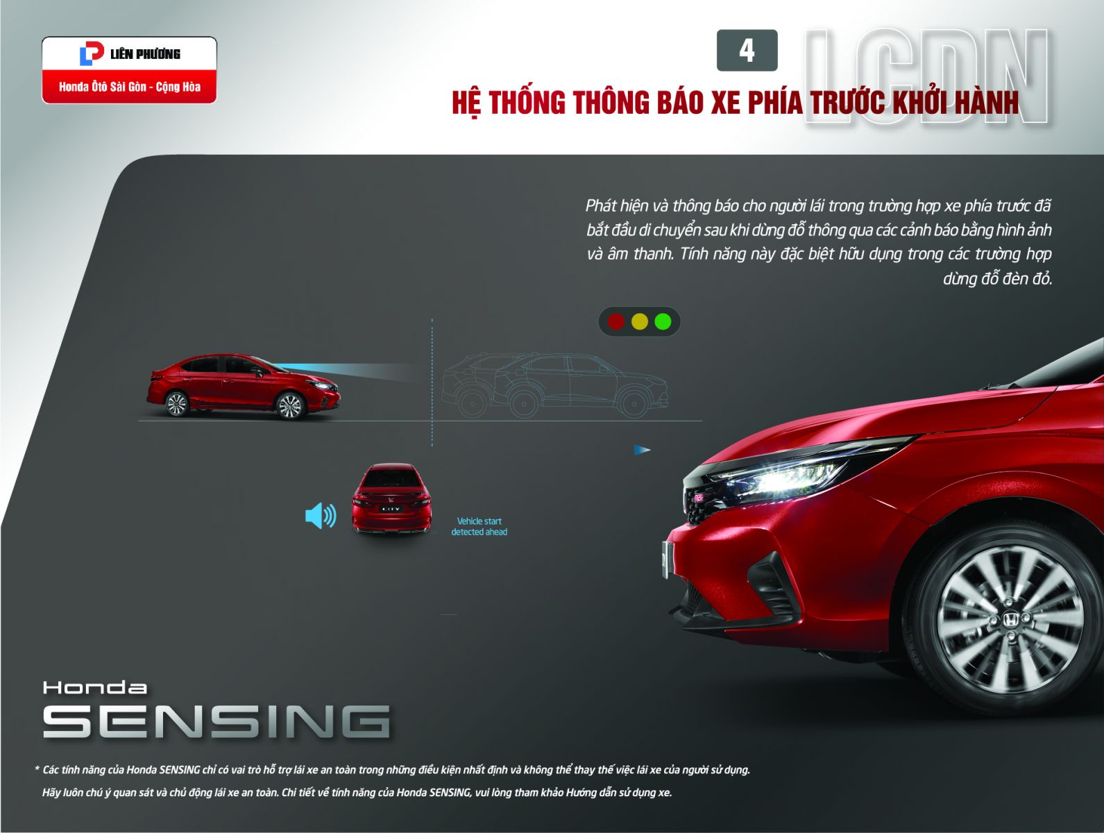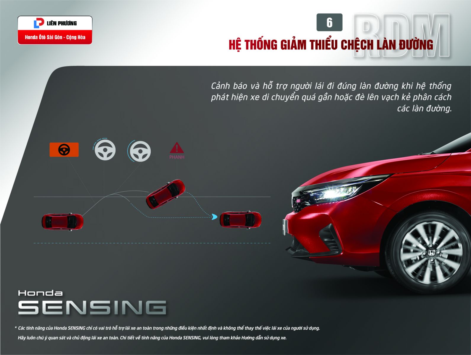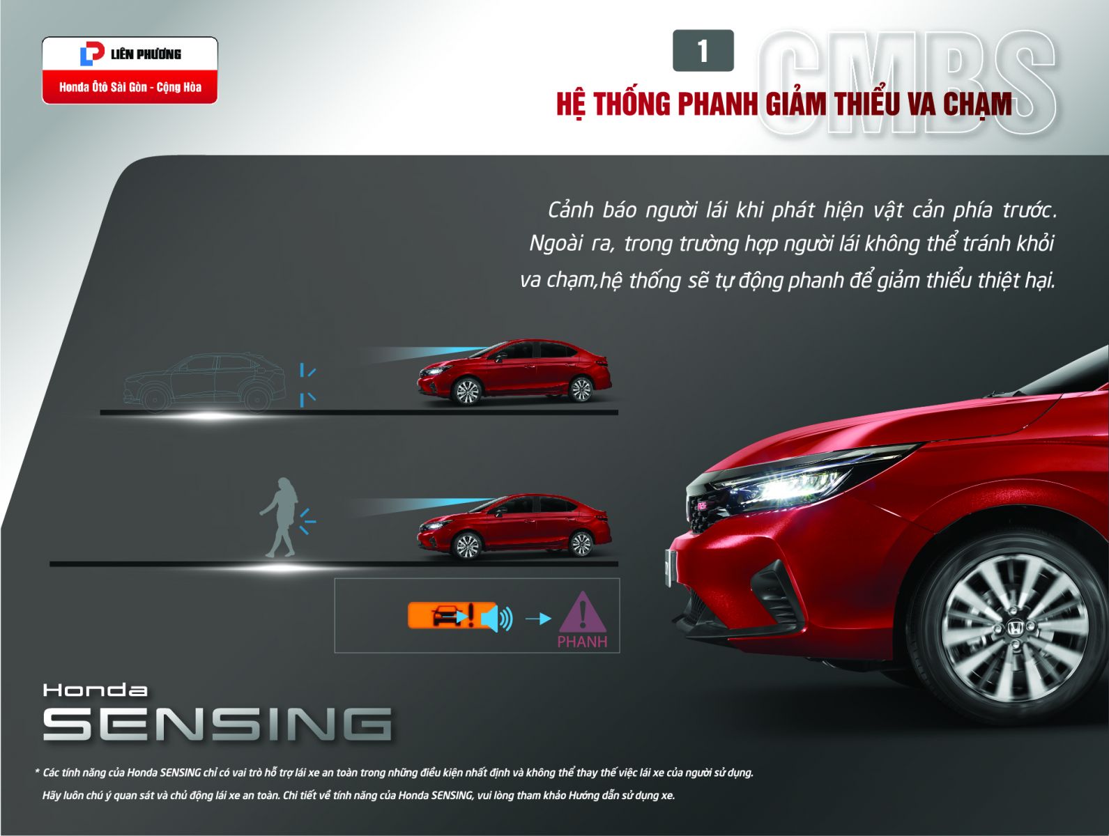 Hệ thống Honda SENSING được trang bị trên City Mới gồm 6 tính năng: [1]- Hệ thống phanh giảm thiểu va chạm (CMBS); [2]- Hệ thống kiểm soát hành trình thích ứng (ACC); [3]- Hệ thống đèn pha thích ứng tự động (AHB); [4]- Hệ thống thông báo xe phía trước khởi hành (LCDN); [5]- Hệ thống hỗ trợ giữ làn đường (LKAS); [6]- Hệ thống giảm thiểu chệch làn đường (RDM). Sau đây, Honda Ôtô Sài Gòn - Cộng Hòa sẽ làm rõ các tính năng này hoạt động như thế nào trong điều kiện thực tế.