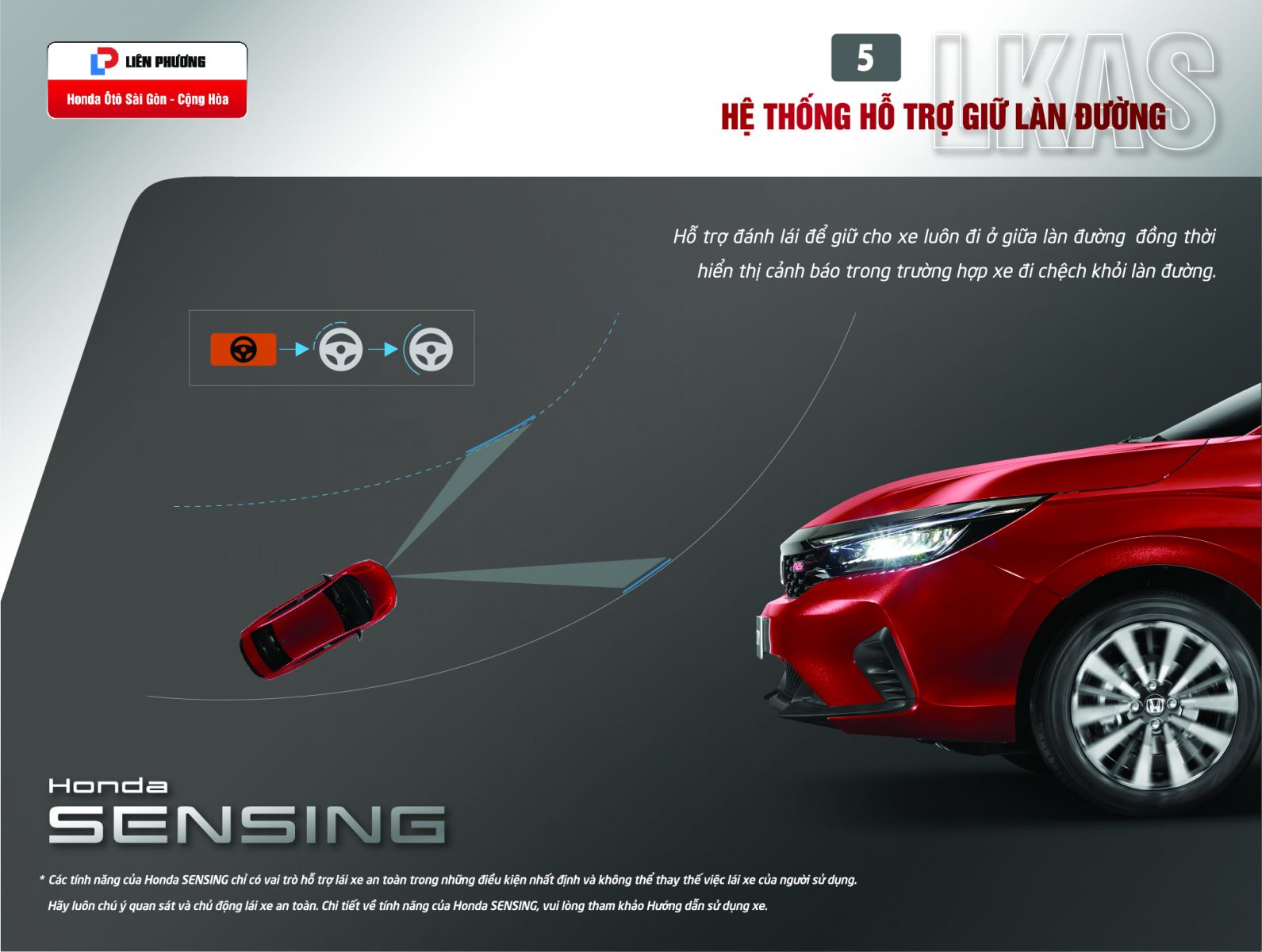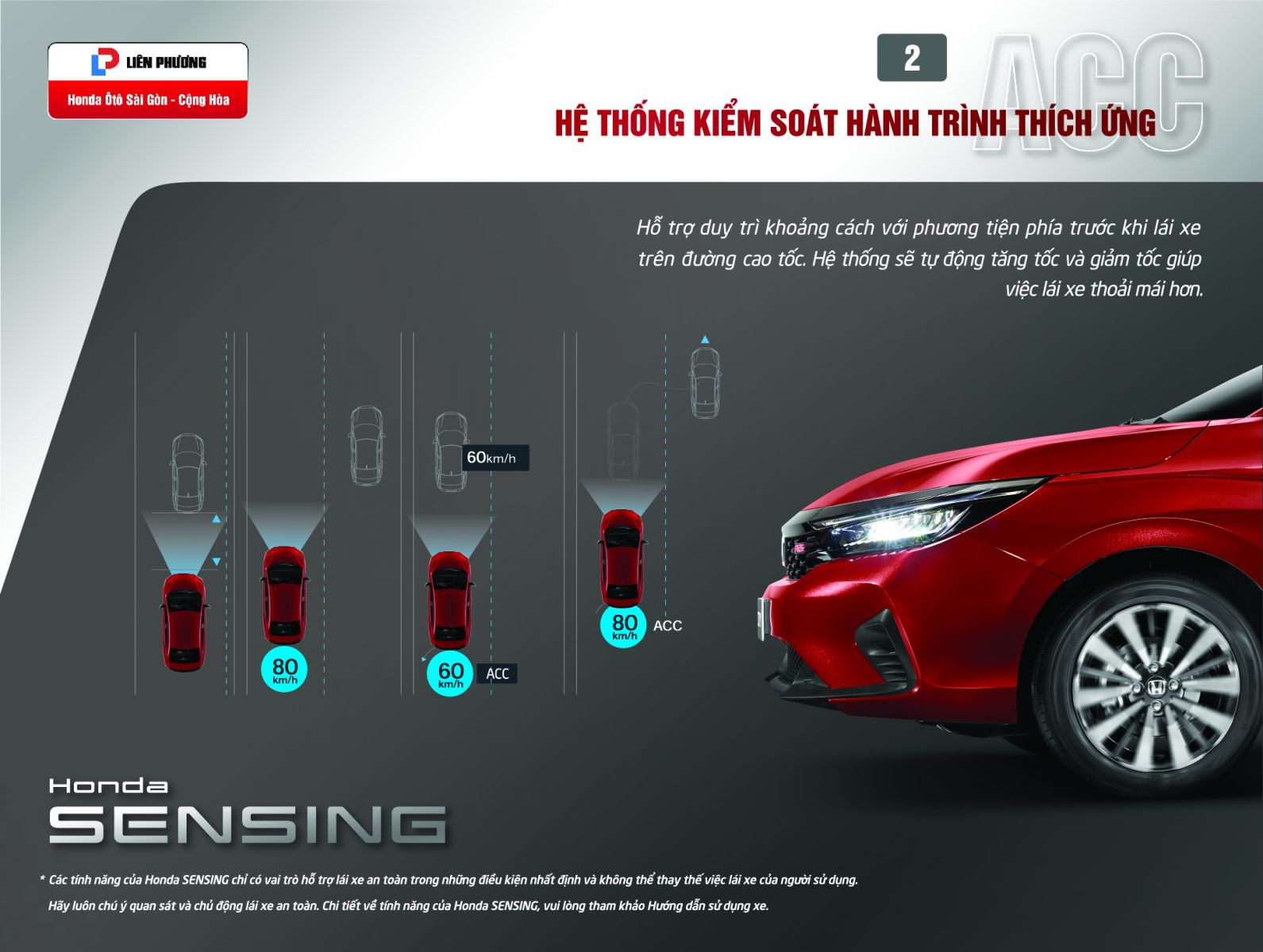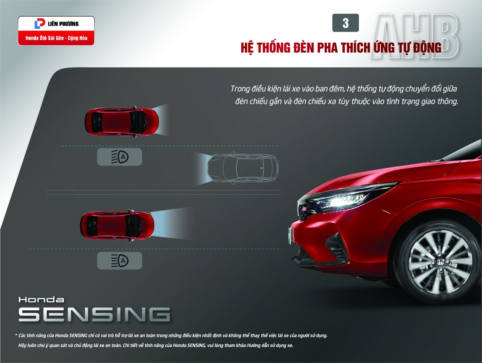 Hệ thống Honda SENSING được trang bị trên City Mới gồm 6 tính năng: [1]- Hệ thống phanh giảm thiểu va chạm (CMBS); [2]- Hệ thống kiểm soát hành trình thích ứng (ACC); [3]- Hệ thống đèn pha thích ứng tự động (AHB); [4]- Hệ thống thông báo xe phía trước khởi hành (LCDN); [5]- Hệ thống hỗ trợ giữ làn đường (LKAS); [6]- Hệ thống giảm thiểu chệch làn đường (RDM). Sau đây, Honda Ôtô Sài Gòn - Cộng Hòa sẽ làm rõ các tính năng này hoạt động như thế nào trong điều kiện thực tế.