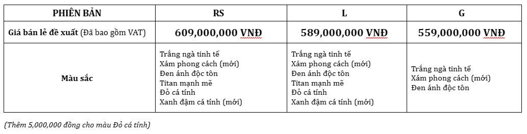 Honda City mới gồm 03 phiên bản (RS, L, G) cùng 6 màu ngoại thất được lắp ráp, phân phối chính hãng tại Việt Nam với mức giá bán lẻ đề xuất như sau: