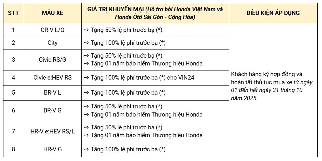 Vui đón Tết Trung Thu, Honda Việt Nam phối hợp cùng Honda Ôtô Sài Gòn - Cộng Hòa triển khai chương trình khuyến mại hấp dẫn cho các dòng xe ô tô Honda “Rước Honda liền tay - Miễn phí trước bạ ngay” . Chương trình áp dụng từ ngày 01 tháng 10 năm 2025 đến hết ngày 31 tháng 10 năm 2025.