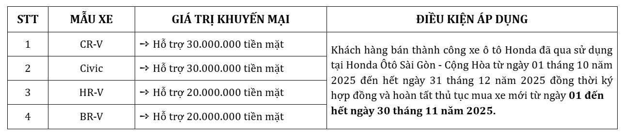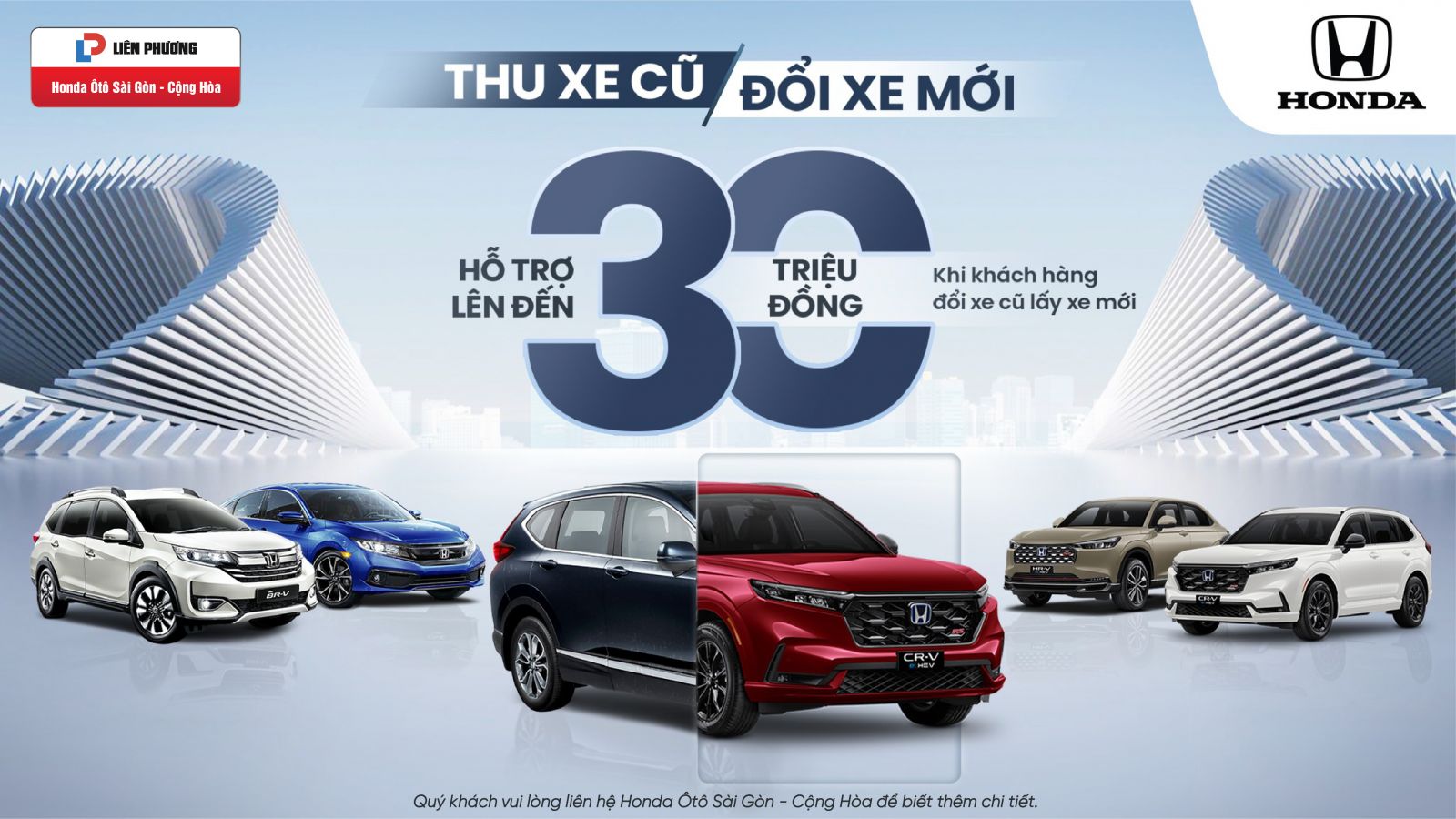 Nhằm cung cấp tới Quý khách hàng phương án giao dịch xe ô tô đã qua sử dụng minh bạch, thuận tiện, Honda Việt Nam đã triển khai Chương trình “Hỗ trợ siêu hời – Lên đời xế mới”. Từ ngày 01 tháng 11 năm 2025 đến hết ngày 30 tháng 11 năm 2025, Honda Việt Nam phối hợp cùng Honda Ôtô Sài Gòn - Cộng Hòa triển khai chương trình khuyến mại hấp dẫn cho khách hàng đổi xe mới chính hãng.