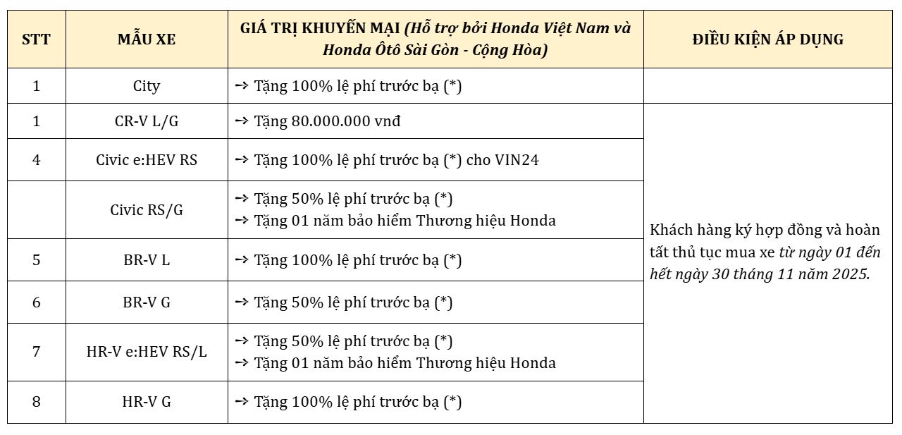Honda Việt Nam phối hợp cùng Honda Ôtô Sài Gòn - Cộng Hòa triển khai tháng tri ân với khuyến mại cực lớn dành cho các mẫu xe ô tô Honda theo danh sách dưới đây, chương trình khuyến mại diễn ra từ ngày 01 tháng 11 năm 2025 đến hết ngày 30 tháng 11 năm 2025.