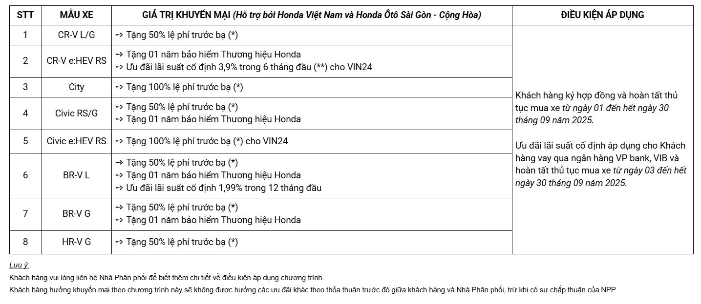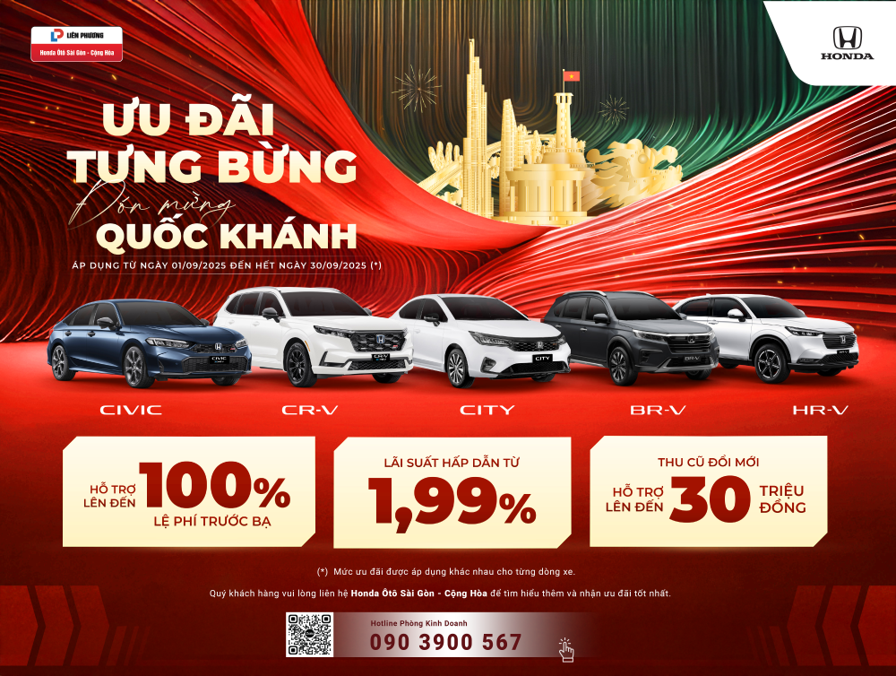 Tưng bừng chào đón Đại lễ Quốc khánh 2/9, với mong muốn mang đến nhiều hơn nữa cơ hội trải nghiệm các mẫu xe ô tô Honda và tận hưởng những khoảnh khắc du ngoạn tuyệt vời cho Khách hàng, Honda Việt Nam (HVN) phối hợp cùng Honda Ôtô Sài Gòn - Cộng Hòa triển khai chương trình khuyến mại hấp dẫn cho các dòng xe ô tô Honda từ ngày 01 tháng 09 năm 2025 đến hết ngày 30 tháng 9 năm 2025.